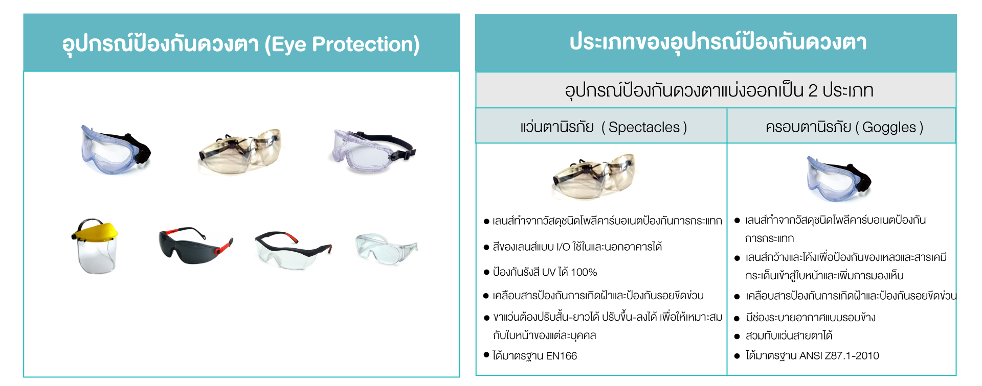 คืออุปกรณ์ที่ออกแบบมาเพื่อป้องกันดวงตาจากอันตรายที่อาจเกิดขึ้นในขณะทำงาน เช่น เศษวัสดุ ฝุ่นละออง สารเคมี ละอองน้ำ มลพิษ แสงจ้า หรือรังสีอันตราย โดยเฉพาะในโรงงานอุตสาหกรรม งานก่อสร้าง งานเชื่อม ห้องแล็บ หรือโรงงานเคมี