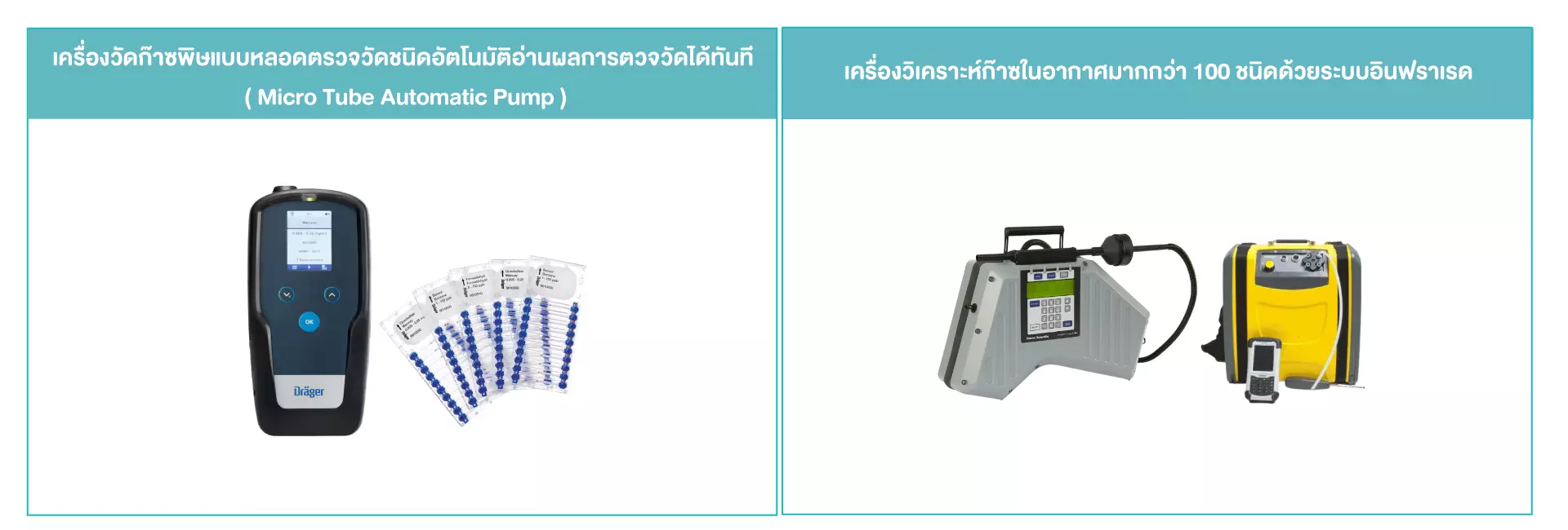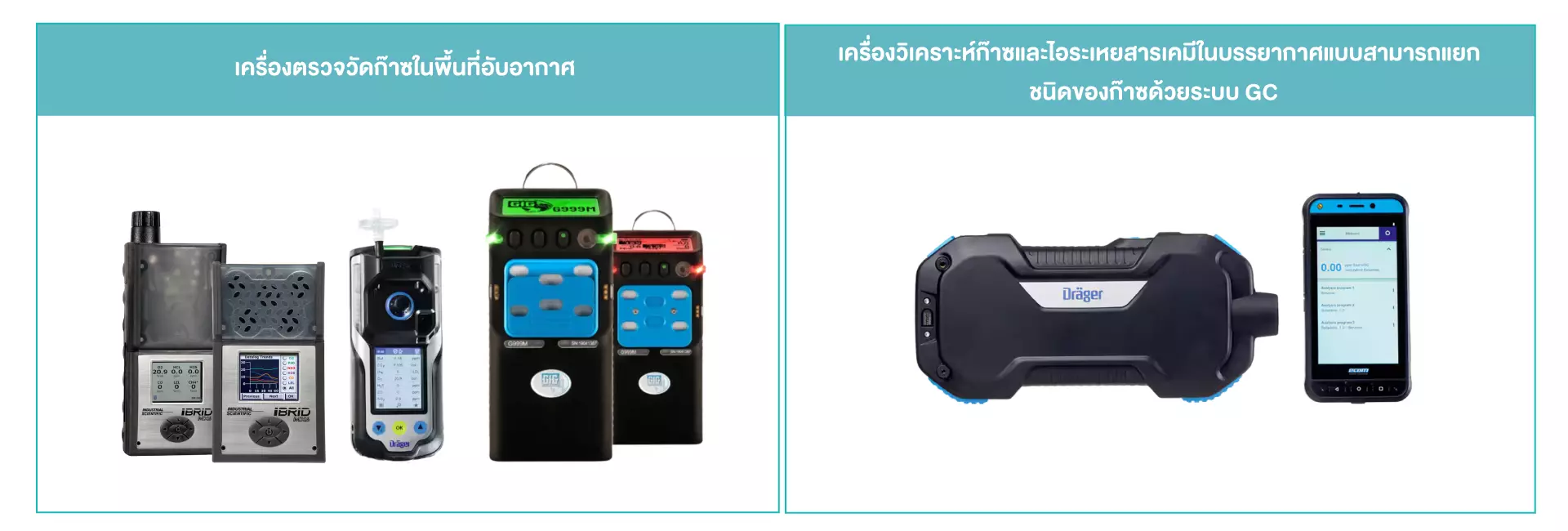 - เครื่องตรวจจับก๊าซ (Gas Detector): มีทั้งแบบพกพาและแบบติดตั้งถาวร สามารถตรวจจับได้ทั้งก๊าซที่ติดไฟได้, ก๊าซพิษ และระดับออกซิเจน