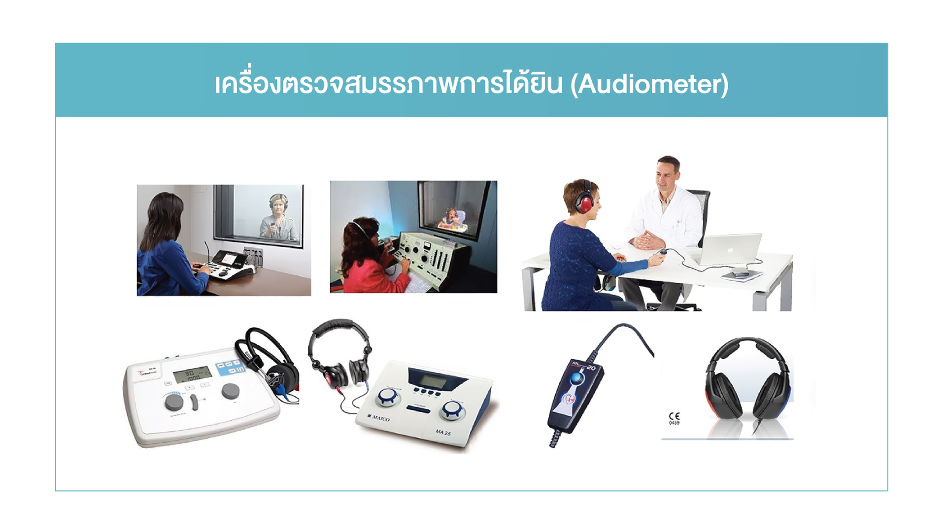 - เครื่องตรวจวัดการได้ยิน (Audiometer): อุปกรณ์ที่สร้างเสียงที่มีความถี่และความดังที่แตกต่างกัน เพื่อใช้ทดสอบการได้ยิน