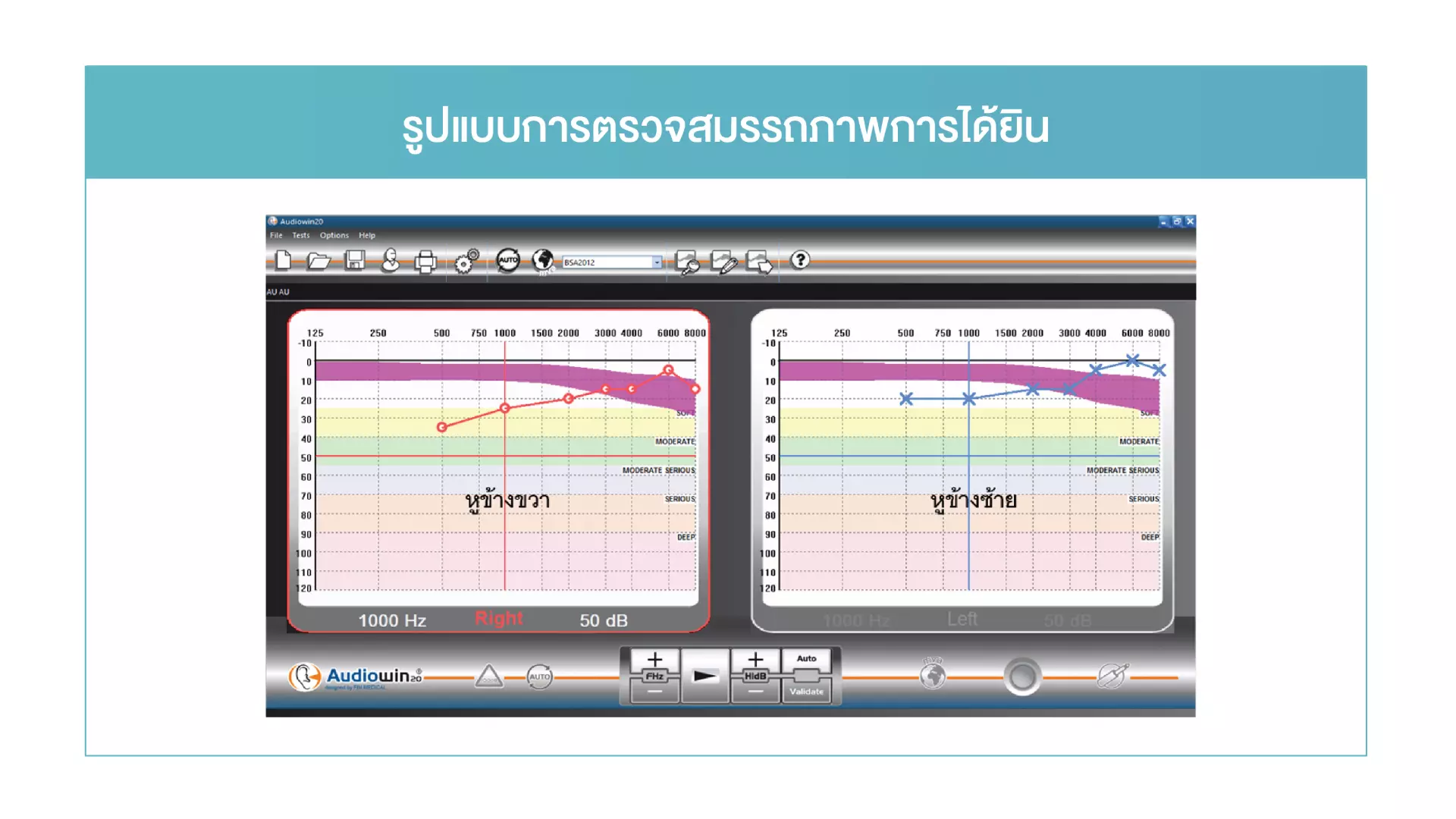 - ความปลอดภัยในการทำงาน: เพื่อประเมินว่าพนักงานที่ทำงานในพื้นที่เสียงดังมีภาวะการได้ยินบกพร่องหรือไม่ และกำหนดมาตรการป้องกันที่เหมาะสม