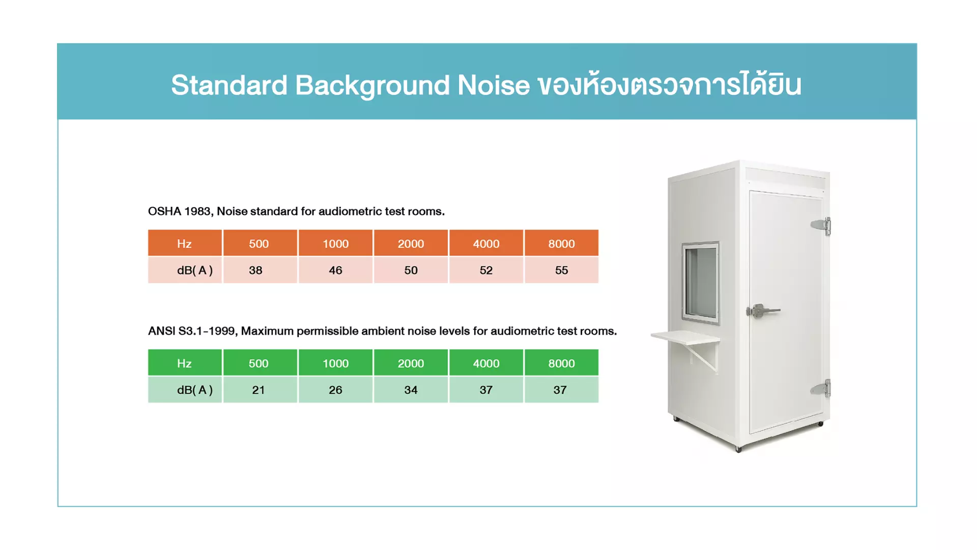 - ห้องตรวจการได้ยิน (Soundproof Booth): เป็นห้องเก็บเสียงที่ใช้ในการตรวจวัดการได้ยิน เพื่อป้องกันเสียงรบกวนจากภายนอก ซึ่งจะช่วยให้ผลการตรวจมีความแม่นยำ