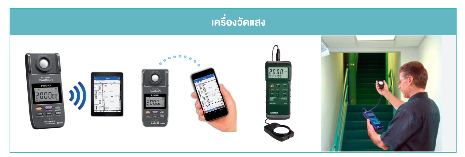 เครื่องมือหลักที่ใช้ในการตรวจวัดแสงสว่างเรียกว่า เครื่องวัดแสง (Lux Meter) หรือ Lux Light Meter ซึ่งมีหลักการทำงานโดยการใช้เซลล์รับแสง (Photocell) ในการแปลงค่าความเข้มแสงเป็นสัญญาณไฟฟ้าแล้วแสดงผลเป็นค่าลักซ์ (Lux) บนหน้าจอ