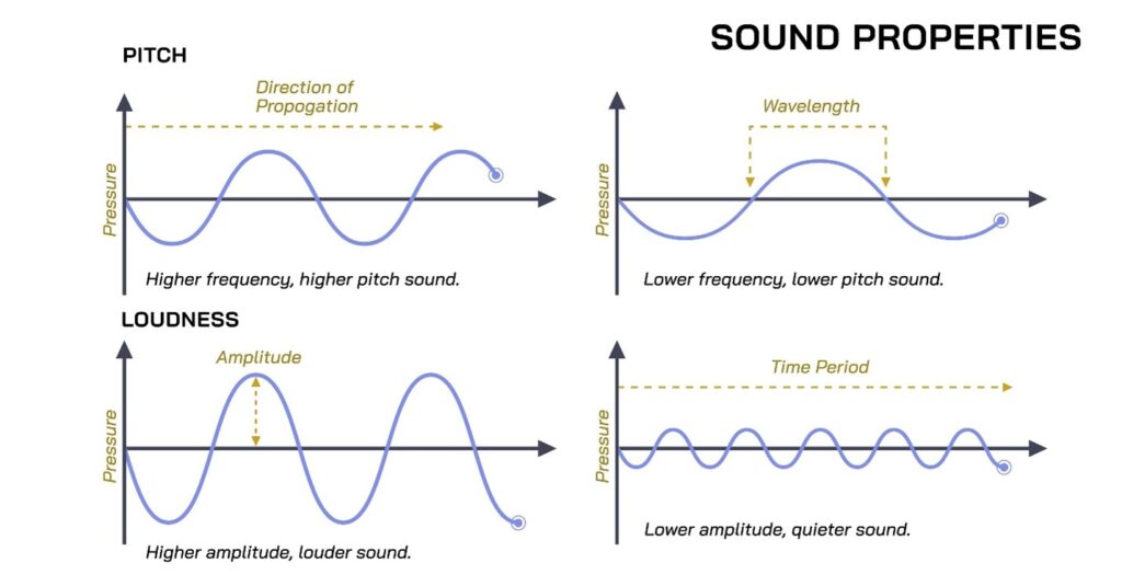 - แอมพลิจูด (Amplitude): คือความสูงของคลื่นเสียงที่บ่งบอกถึงความดังของเสียง มีหน่วยเป็นเดซิเบล (dB) เสียงที่มีแอมพลิจูดสูงจะดังกว่าเสียงที่มีแอมพลิจูดต่ำ